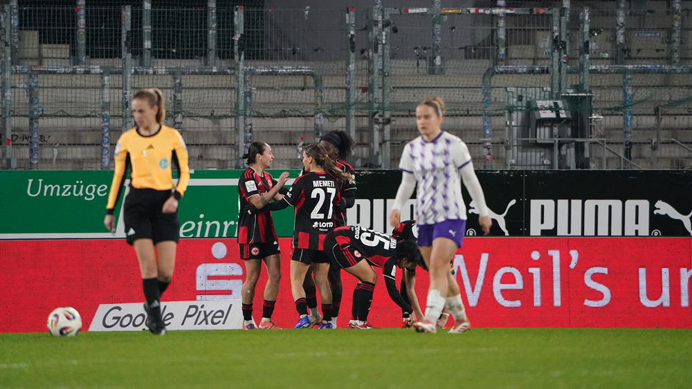 Doch die SGE blieb tonangebend und konnte nach einer guten Viertelstunde in Führung gehen. Nach einer Ecke köpfte Geraldine Reuteler den Ball aus kurzer Distanz zum 0:1 in die Maschen. Nur fünf Minuten später war es erneut Sindermann, die ein weiteres eins gegen eins Duell mit Freigang für sich entschied.