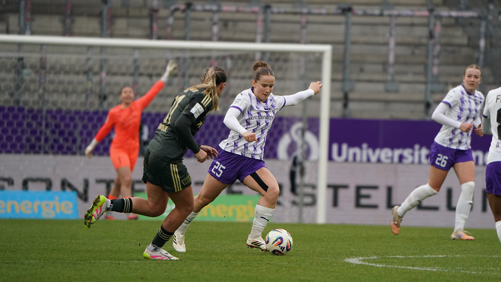 In der 36. Minute durften die Lila-Weißen dann jubeln. Erneut leitete ein Ballgewinn auf der rechten Seite den Angriff ein, Paulina Platner kam an den Ball, hielt nach Zusammenspiel mit Maier einfach mal aus über 20 Metern drauf und traf ins lange Eck. Fünf Minuten später konnte Kim Sindermann im Essener Kasten die Führung festhalten, als sie einen Kopfball von Campbell sehenswert zur Ecke parierte.