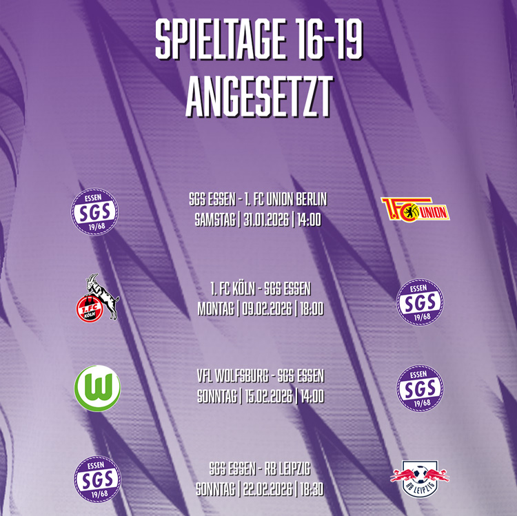 Die zeitgenauen Ansetzungen für die Spieltage 16-19 sind da. Nach dem ersten Spiel der Restrunde beim Hamburger SV am 25.01.2026 trifft die SGS Essen am Samstag, 31.01. auf Union Berlin, am Montag, 09.02. auf den 1. FC Köln, am Sonntag, 15.02. auf den VfL Wolfsburg und ebenfalls an einem Sonntag, 22.02. zuhause auf RB Leipzig.