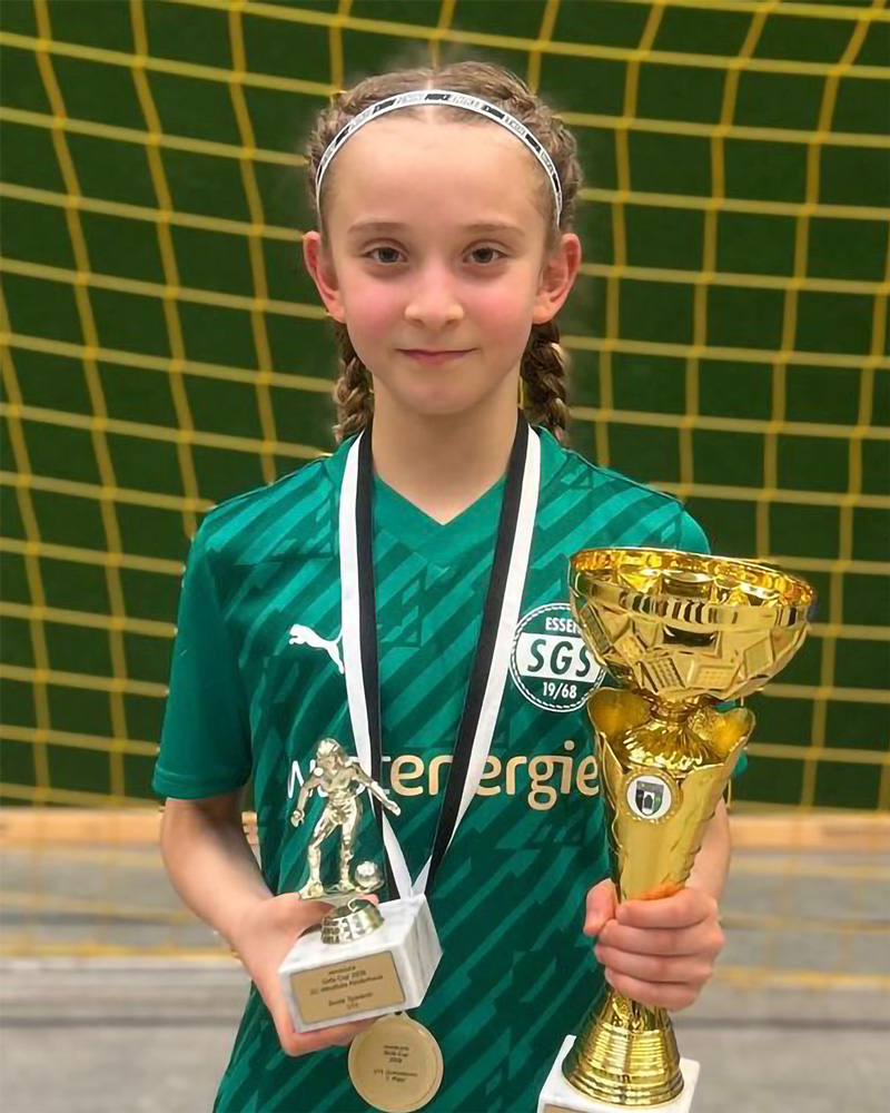 Im Finale kam es zum Duell gegen den Gastgeber Westfalia Kinderhaus. Von Beginn bis zum Schlusspfiff agierte die SGS Essen sehr konzentriert und setzte den Gegner permanent unter Druck. Es war eine starke und überzeugende Teamleistung, die letztlich für den Sieg im Endspiel bedeutete. Glücklich reckte unsere jüngsten Nachwuchsspielerinnen den Pokal in die Höhe.